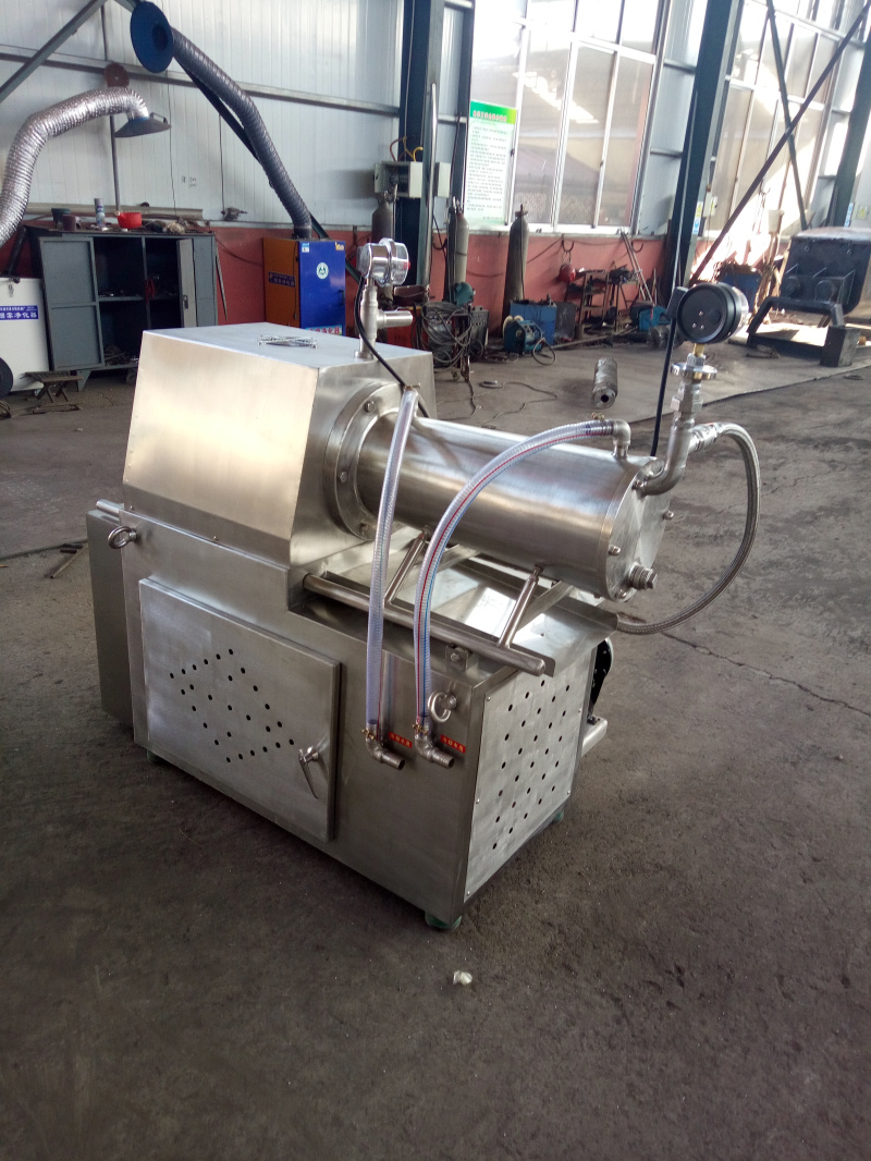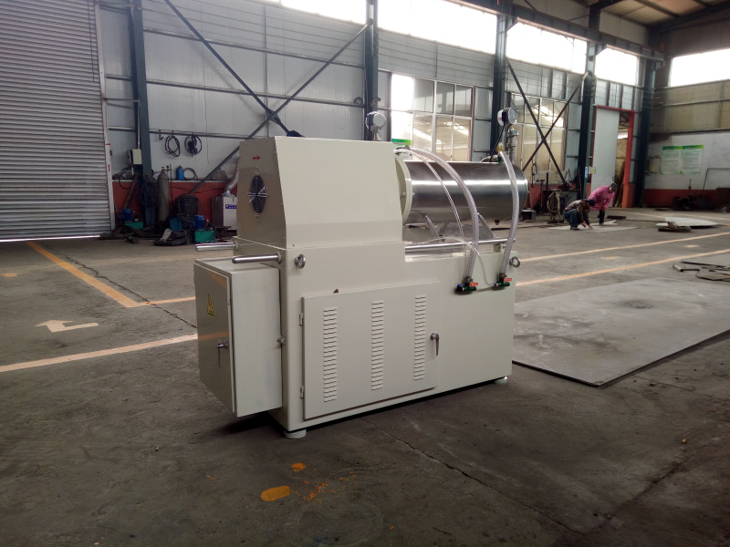 臥式砂磨機(jī)是利用料泵將經(jīng)過攪拌機(jī)預(yù)分散潤濕處理后的固-液相混合物料輸入筒體內(nèi),物料和筒體內(nèi)的研磨介質(zhì)一起被高速旋轉(zhuǎn)的分散器攪動,從而使物料中的固體 微粒和研磨介質(zhì)相互間產(chǎn)生更加強(qiáng)烈的碰撞、摩擦、剪切作用,達(dá)到加快磨細(xì)微粒和分散聚集體的目的。研磨分散后的物料經(jīng)過動態(tài)分離器分離研磨介質(zhì),從出料管流出。臥式砂磨機(jī)特別適合分散研磨粘度高而粒度要求細(xì)的產(chǎn)品。